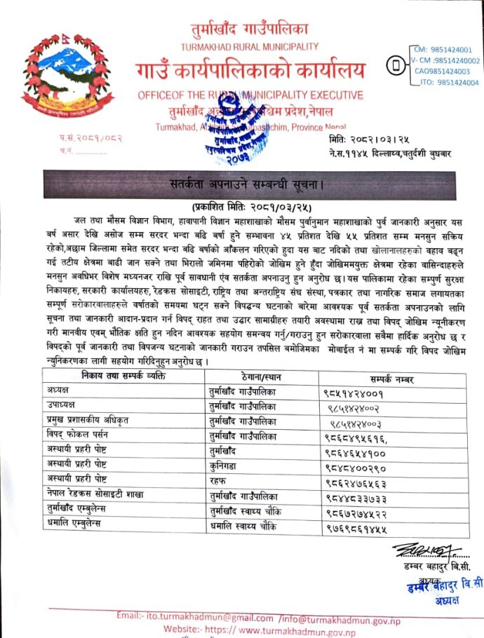 गाउँपालिकाले वर्षातको समयमा बाढीपहिरो, डुबान, कटान लगायतका विपद्जन्य घटनाबाट बच्न आवश्यक पूर्व सतर्कता अपनाउन र विपद्को पूर्व जानकारीका लागि निम्न सम्पर्क व्यक्ति तथा निकायहरूसँग समन्वय गर्न अनुरोध गरेको छ ।